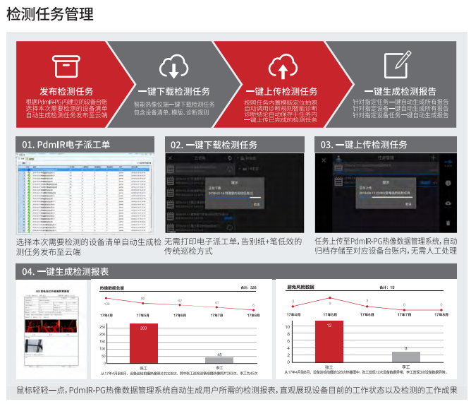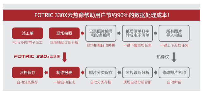 與熱像儀相比,F(xiàn)OTRIC 330X云熱像能幫助用戶提高十倍工作效率,內(nèi)置電力專家的診斷經(jīng)驗(yàn)和電力行業(yè)診斷規(guī)范,具有精確檢測(cè)的智能診斷分析能力;基于PdmIR熱像數(shù)據(jù)管理系統(tǒng)會(huì)自動(dòng)管理并整合設(shè)備臺(tái)賬、檢測(cè)任務(wù)和檢測(cè)數(shù)據(jù),幫助用戶節(jié)約90%的數(shù)據(jù)處理成本。
