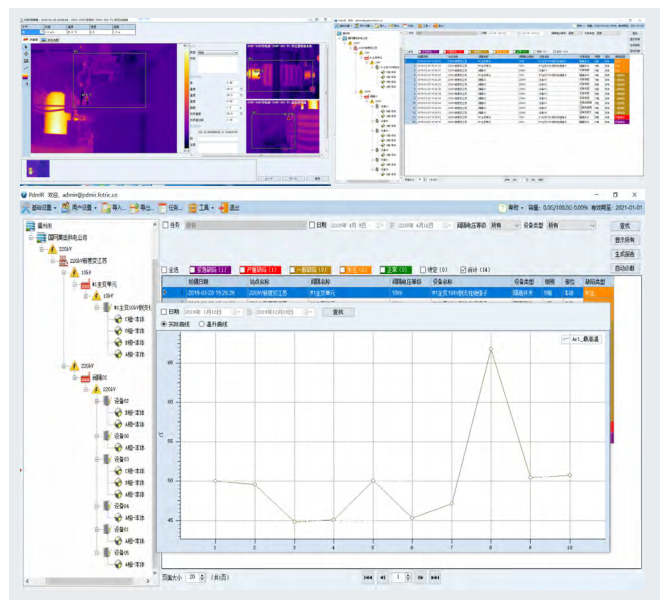 FOTRIC PdmIR-PG熱像數(shù)據(jù)管理系統(tǒng)以樹(shù)狀結(jié)構(gòu)的方式,電子化管理設(shè)備臺(tái)賬,為用戶提供檢測(cè)任務(wù)數(shù)據(jù)統(tǒng)計(jì)、工作報(bào)表展示,數(shù)據(jù)查詢、圖像分析、歷史趨勢(shì)分析等豐富的數(shù)據(jù)管理功能。