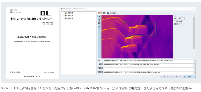 FOTRIC.330X云熱像內(nèi)置的診斷標(biāo)準(zhǔn)可以是電力行業(yè)標(biāo)準(zhǔn)DL/T 664-2016版的《帶電設(shè)備紅外診斷應(yīng)用規(guī)范》,也可以是電力專家的經(jīng)驗(yàn)和其他標(biāo)準(zhǔn)。