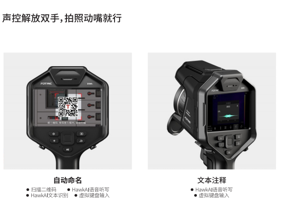 FOTRIC全新推出的HawkAI智能助手,不止具備語(yǔ)音控制、語(yǔ)音聽(tīng)寫(xiě)、文本識(shí)別和智能按鍵功能,實(shí)現(xiàn)自動(dòng)命名熱像圖,現(xiàn)場(chǎng)快速添加文本注釋。