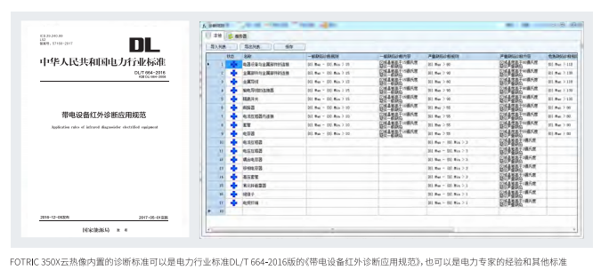 FOTRIC.350X云熱像內置的診斷標準可以是電力行業標準DL/T 664-2016版的《帶電設備紅外診斷應用規范》,也可以是電力專家的經驗和其他標準。