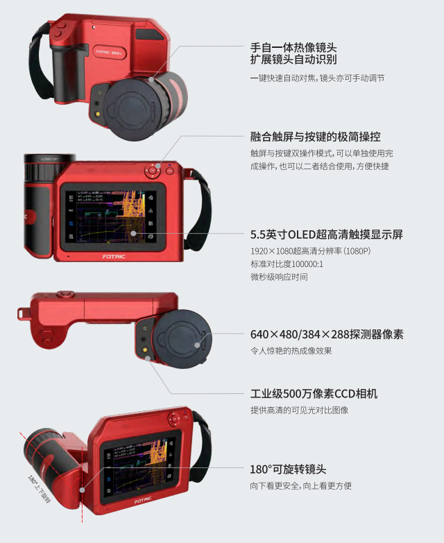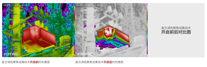 FOTRIC自有的復合調色聚焦成像技術,其出色的熱成像效果,非常適用于復雜場景中分析特定目標的細微溫差,有利于現場快速得出正確的診斷結論(FOTRIC自有技術)。