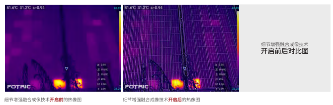 FOTRIC自有的細節增強融合成像技術,支持在熱像圖上融合可見光輪廓細節,輕松定位故障的具體位置(FOTRIC自有技術)。