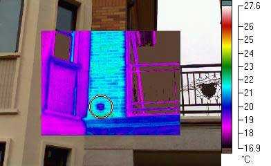 使用澆熱水的方式可以使滲漏部位發生明顯的溫度分布變化,高水溫、大水量將使熱像檢測效果更為明顯,該檢測方法適合外墻表面因物品安裝位置、潮濕等原因無法直接進行熱像檢測的現場,利用水溫的變化,在房間內部發現滲漏部位并加以驗證。