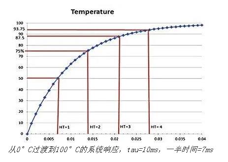 從0°C過渡到100°C的系統響應,tau=10ms,一半時間=7ms