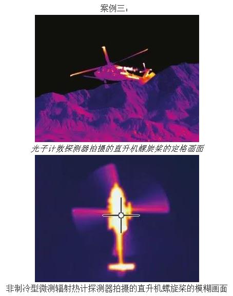 為了進一步說明問題,來看最后一例:測量直升機螺旋槳的熱效應。螺旋槳與空氣之間產生的摩擦會沿著螺旋槳形成一定的熱梯度,越靠近葉片尖端,溫度越高。使用非制冷微測熱輻射計熱像儀,無法有效的定格目標,不能準確地描述和測量真實的溫度。